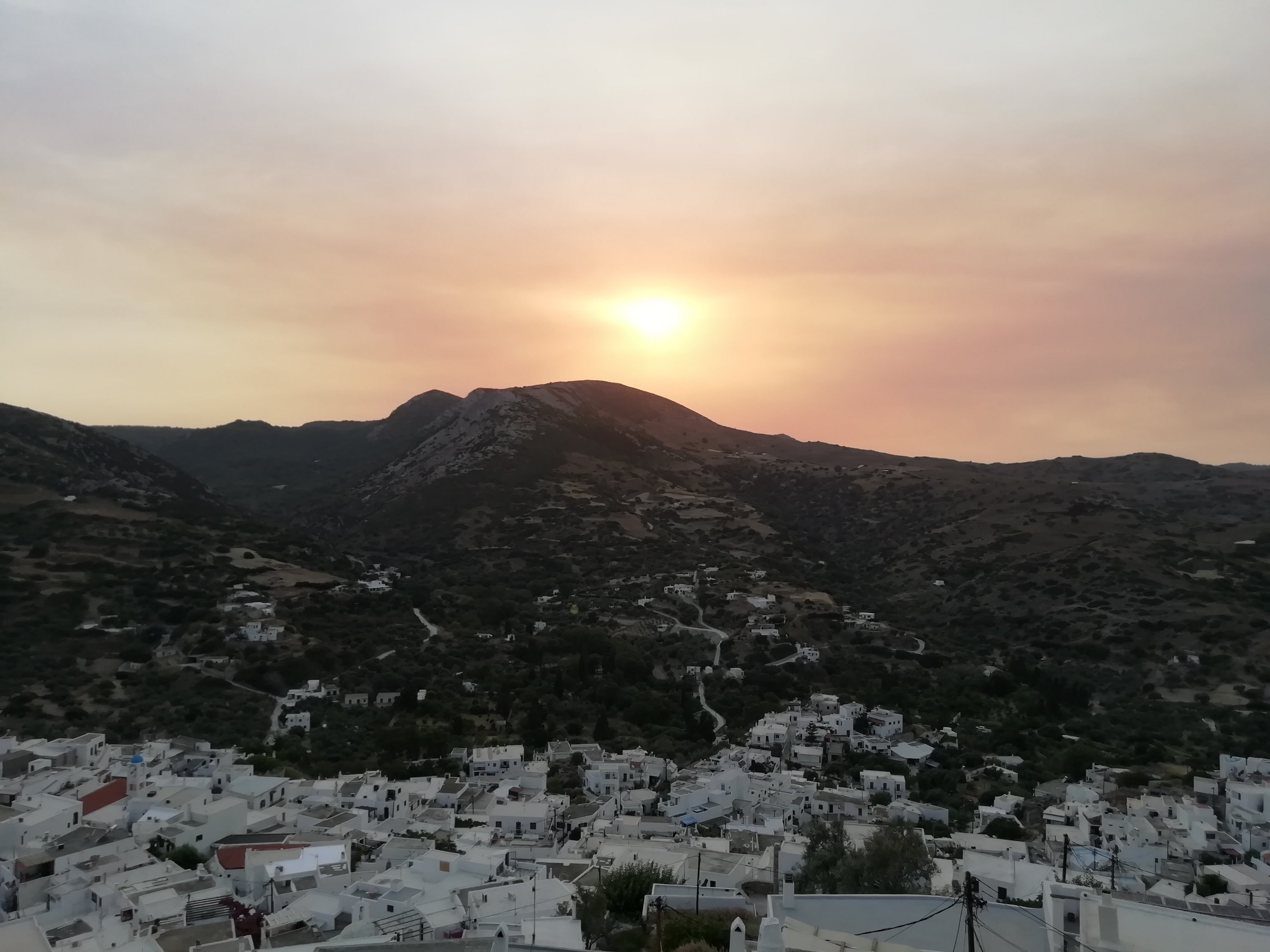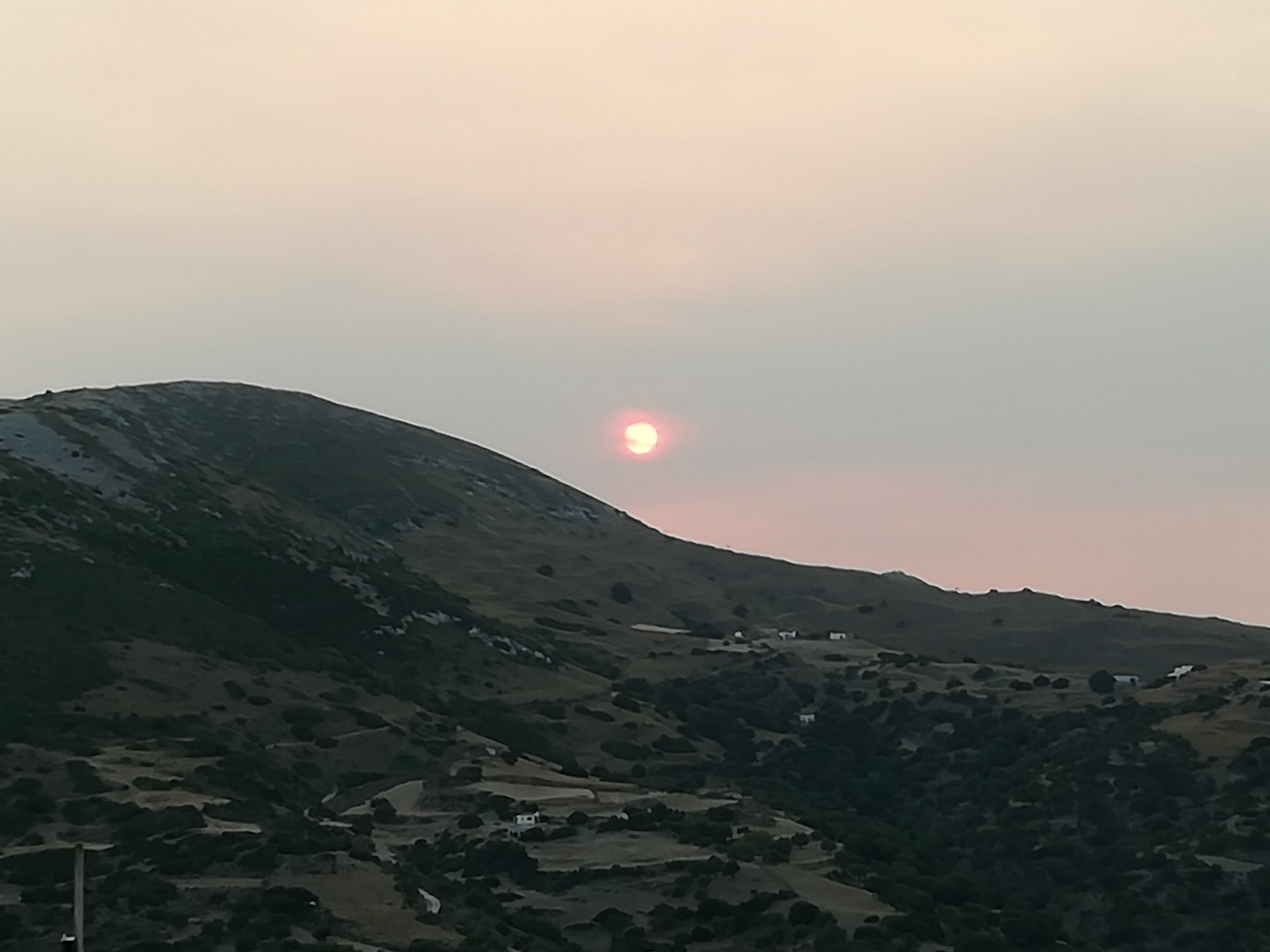 Los incendios se han multiplicado en Grecia en las últimas horas. La isla de Eubea es una de las más afectadas. El humo y las cenizas llegan hasta la vecina Esciros. Atardecer como pocos en Esciros. El humo de los incendios cercanos, sumado a la prolongada ola de calor, le ha dado un toque apocalíptico a la puesta de sol de esta tarde.
